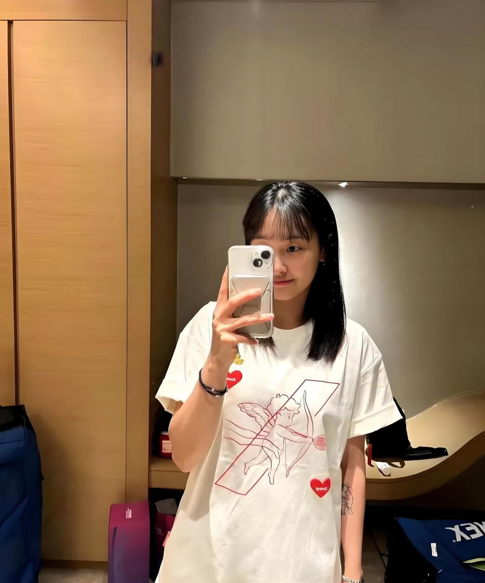 今年苏迪曼杯在厦门举行,中国队在决赛中3-0战胜了韩国队夺冠。赛后,蔡侑玎收到了郑思维自创品牌的白色运动T恤礼物。她开心试穿并通过社交媒体向老朋友表达了感谢。“谢谢你思维,衣服看起来太漂亮了。”